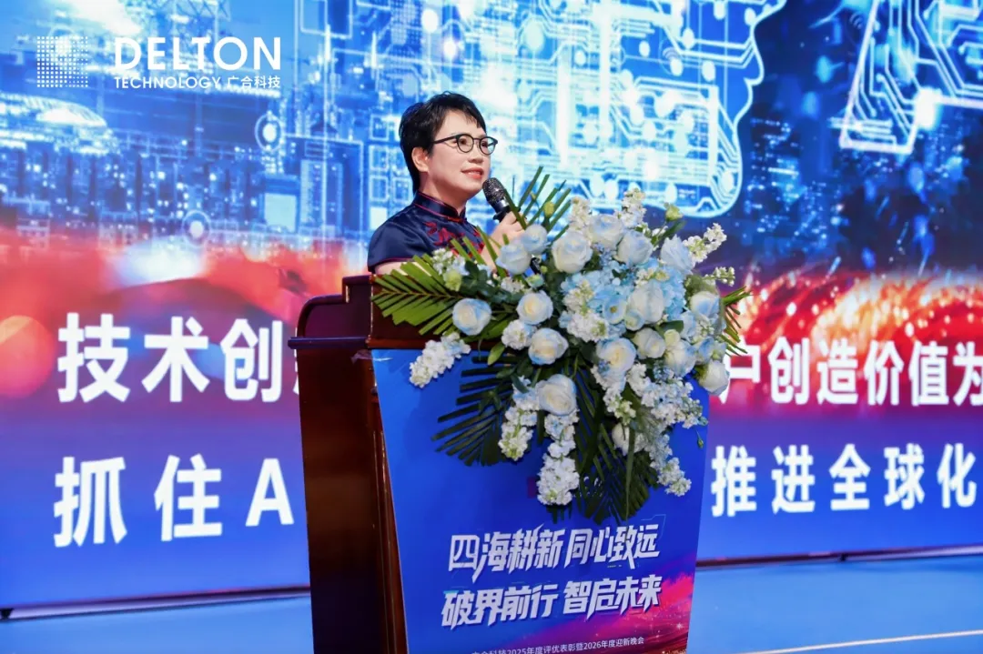 集团总经理曾红女士随后发表致辞,回顾2025年奋斗成果,擘画新一年发展蓝图。曾总表示,2025年公司把握全球AI机遇,广州基地产能提升,黄石基地产能全面释放,泰国工厂实现高质量量产,赢得客户高度认可。展望2026,曾总提出发展高技术、发力AI创新等六个方向,号召全员共攀高峰,开启高质量发展新征程,并向大家致以马年新春祝福。随后,肖董、刘董、曾总共同登台,率全场举杯敬酒。杯中酒满,目光如炬。这一刻,方向统一,人心归队。